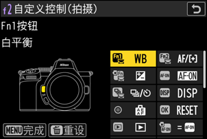 选项 w [Fn1按钮] y [Fn2按钮] n [竖拍Fn按钮] V [AF-ON按钮] m [释放模式/保护按钮] D [DISP按钮] 8 [副选择器中央] p [OK按钮] q [播放按钮] j [竖拍AF-ON按钮] F [竖拍多重选择器中央] z [视频录制按钮] R [ISO感光度按钮] Q [曝光补偿按钮] x [优化校准按钮] y [指令拨盘] S [镜头Fn按钮] 3 [镜头Fn2按钮] S [镜头Fn环(逆时针)] R [镜头Fn环(顺时针)] T [镜头记忆设定按钮] l [镜头控制环] 可指定的功能如下所示。可用功能根据控制的不同而异。