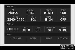 选项 0 G [画面尺寸/帧频] 视频画面尺寸和帧频选项 J [选择图像区域] 视频图像区域选项 N [目标位置] 目标位置 E [曝光补偿] 曝光补偿 9 [ISO感光度设定] ISO感光度 m [白平衡] 白平衡 h [设定优化校准] 优化校准 6 [HLG品质] HLG品质 y [动态D-Lighting] 动态D‑Lighting h [皮肤柔和] 皮肤柔和 i [调整人像形象] 调整人像形象 w [测光] 测光 s [对焦模式] 对焦模式 7 [AF区域模式/拍摄对象侦测] AF区域模式、拍摄对象侦测 H [产品展示模式] 产品展示模式 u [减震] 减震 4 [电子减震] 电子减震 H [麦克风灵敏度] 麦克风灵敏度 5 [音频衰减器] 音频衰减器 6 [频响] 频响 7 [降低风噪] 降低风噪 8 [耳机音量] 耳机音量 H [高分辨率数字变焦] 高分辨率数字变焦 L [静音模式] 静音模式 w [自定义控制] g2:自定义控制 W [峰值对焦辅助] a12:峰值对焦辅助 9 [条纹图案] g12:条纹图案 3 [显示屏/取景器亮度] 显示屏亮度、取景器亮度 8 [多重选择器电动光圈] 多重选择器电动光圈 9 [多重选择器曝光补偿] 多重选择器曝光补偿 l [查看视频信息] 查看视频信息 v [暖色显示屏颜色] d12:暖色显示屏颜色 u [飞行模式] 飞行模式 W [无线遥控连接(ML-L7)] 无线遥控(ML-L7)选项 W [Bluetooth遥控器连接] Bluetooth遥控器选项 a [电池匣信息] 电池匣信息 E [视频自拍] 视频自拍