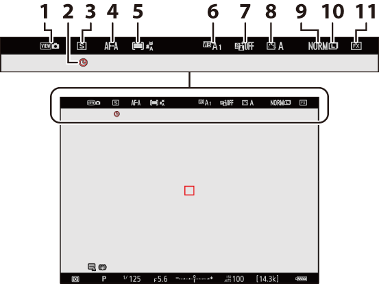 在預設設定下,以下指示器將出現在觀景器中。有關可能會顯示的指示器的完整列表,請參見“技術註釋”章節中“相機顯示”部分的“觀景器”(0 觀景器)。