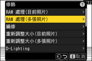 在 i 選單中選擇 [修飾],然後反白顯示 [RAW 處理(多張照片)] 並按下 2。