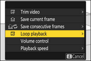 Myös [ Toistonopeus ] -kohta on lisätty mukautettuun asetukseen f3 [ Mukautetut säätimet (toisto) ]. Kun toistonopeus on määritetty pää- tai sivukomentokiekolle, sitä voidaan muuttaa videon toiston aikana kääntämällä komentokiekkoa ( 0 Uusia rooleja käytettävissä " Pääkomentokiekolla "/ " Sivukomentokiekolla " > " Videon toisto ) ).