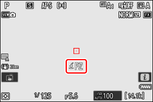 - Apăsând și menținând butonul de control alocat [ Salvare și încărcare poziție zoom motor ] în timp ce este atașat un obiectiv cu zoom puternic (PZ), se va afișa o pictogramă t pe afișajul de fotografiere și se va salva poziția curentă a zoomului. Aceeași poziție de zoom este utilizată atât pentru fotografierea statică, cât și pentru înregistrarea video.