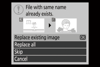 Kui sihtkaust sisaldab faili, millel on sama nimega kopeeritav pilt, kuvatakse kinnitusdialoog. Olemasoleva faili või failide asendamiseks valige [ ] või [ Sihtkaustas olevaid kaitstud faile ei asendata. Valige [ ], et jätkata olemasolevaid faile asendamata. Valige [ ], et väljuda ilma uusi pilte kopeerimata.
