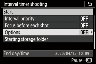Z 7II puhul intervalltaimeriga pildistamist ei alustata, kui kõik suvandid on määratud allpool kirjeldatud viisil. Intervallvideo salvestamiseks nendes tingimustes kasutage pildistamismenüüs valikut Pange tähele, et sel juhul ei salvestata üksikuid kaadreid eraldi.