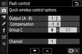 Valige see üksus, et kontrollida suhtelist tasakaalu kaugvälklampide vahel rühmades A ja B ning reguleerida välgu väljundit grupi C jaoks. Grupi C väljundit reguleeritakse käsitsi.