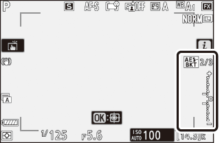 Пока действует брекетинг, на дисплее отображается значок брекетинга, индикатор выполнения брекетинга и количество снимков, оставшихся в последовательности брекетинга. После каждого выстрела с индикатора исчезнет сегмент, а количество оставшихся снимков уменьшится на один.