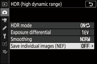 Выберите [ ], чтобы сохранить каждый из отдельных снимков, использованных для создания HDR-изображения; снимки сохраняются в формате NEF (RAW).