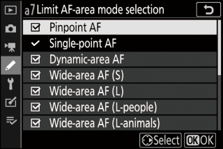 Выберите режимы зоны АФ, которые можно выбрать с помощью меню i или пользовательских элементов управления.