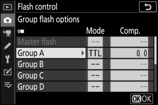 Выберите режим управления вспышкой и мощность вспышки для вспышек в каждой группе.