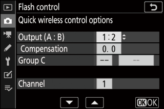 Выберите этот пункт, чтобы контролировать относительный баланс между дистанционными вспышками в группах A и B и регулировать мощность вспышки для группы C. Мощность для группы C регулируется вручную.