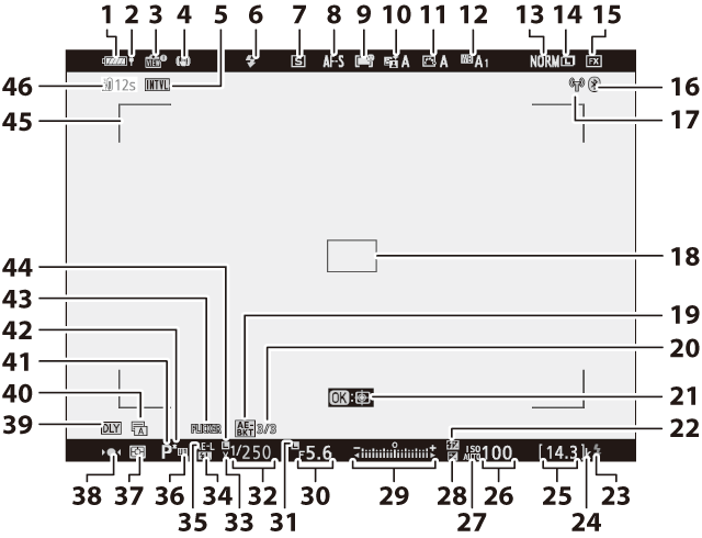 Индикатор брекетинга экспозиции и вспышки ( Брекетинг экспозиции и вспышки ) Индикатор брекетинга баланса белого ( Брекетинг баланса белого ) Индикатор брекетинга ADL (брекетинг ADL ) Индикатор HDR ( съемка HDR-фотографий ) Индикатор мультиэкспозиции ( Создание мультиэкспозиции) |