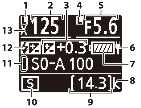 Индикатор компенсации экспозиции ( кнопка E (компенсация экспозиции) ) Значение компенсации экспозиции ( кнопка E (компенсация экспозиции) ) |
