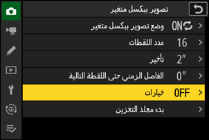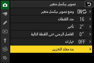 | [تأخير] | اختر مدة التأخير المطلوبة بين الضغط على زر تحرير الغالق ضغطة كاملة والبدء في التصوير ببكسل متغير. |