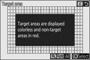 | [ Doelgebied ] | Selecteer een gebied voor onderwerpdetectie wanneer [ Auto-area AF ] is geselecteerd voor de AF-gebiedmodus. De automatische opname wordt geactiveerd als een onderwerp dat aan de triggercondities voldoet, wordt gedetecteerd in een van de doelgebieden (punten). Met de selectie van het doelgebied kunt u delen van het beeldkader uitschakelen die worden geblokkeerd door obstakels of die anderszins kunnen worden genegeerd voor onderwerpdetectie, zodat het gewenste onderwerp betrouwbaarder kan worden gedetecteerd. |