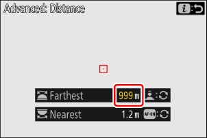 Zalecamy skonfigurowanie opcji [ Najbliższy ] i [ Najdalszy ] w zakresie wartości oznaczonych białymi cyframi. Ustawienie tych opcji na wartości oznaczone na żółto może zmniejszyć dokładność, z jaką aparat wykrywa odległość do obiektu.