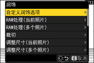 • 加亮显示选项并按下2确定选择(M)或取消选择(U)。仅被勾选(M)的项目才会出现在[润饰]菜单中。