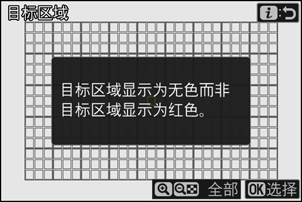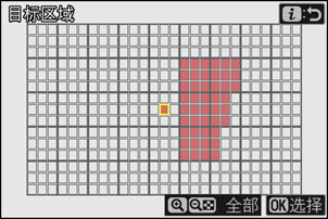 [目标区域] 选择当AF区域模式选为[自动区域AF]时用于拍摄对象侦测的区域。若在任何目标区域(点)侦测到符合触发条件的拍摄对象,则将触发自动拍摄。目标区域选择可用于禁用被障碍物遮挡的构图区域,或是就拍摄对象侦测目的而言可以忽略的构图区域,以确保能更可靠地侦测到所需拍摄对象。