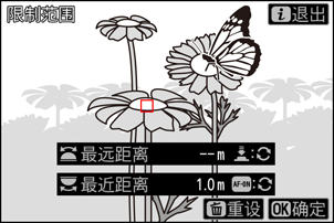 将对焦点置于最近距离处的拍摄对象上并按下AF-ON按钮可设定最近距离。旋转主指令拨盘或者按住AF-ON按钮并同时旋转镜头对焦环可微调最近距离。