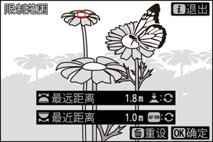将对焦点置于最远距离处的拍摄对象上并半按快门释放按钮可设定最远距离。旋转副指令拨盘或者半按住快门释放按钮并同时旋转镜头对焦环可微调最远距离。
