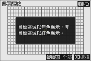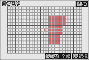 - 選擇當在自動對焦模式下將 AF 區域模式選為 [自動區域 AF] 或使用手動對焦時,用於主體偵測的區域。目標區域選擇在其他 AF 區域模式下不可用。在這種情況下,請進入步驟 10。