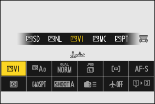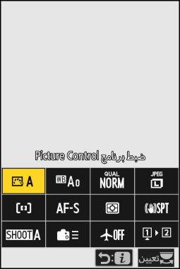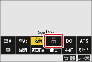 يؤدي الضغط على زر i أثناء التصوير الفوتوغرافي الثابت إلى عرض البنود الموضحة أدناه. ظلل البند المطلوب باستخدام زر الاختيار المتعدد واضغط على J لعرض الخيارات.