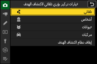 يمكن اختيار فئة الأهداف المُعطاة الأولوية أثناء التركيز البؤري التلقائي باستخدام عناصر الإعداد [] في قوائم تصوير الصور وتسجيل الفيديو، والتي توفر خيارات تتنوع بين []، و[]، و[]، و[]، و[]. تتم الإشارة إلى الهدف الذي تكتشفه الكاميرا بنقطة تركيز بؤري.