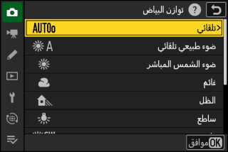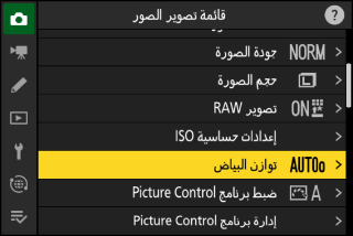 يمكن ضبط توازن البياض أيضًا من خلال قوائم تصوير الصور وتسجيل الفيديو.