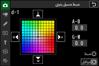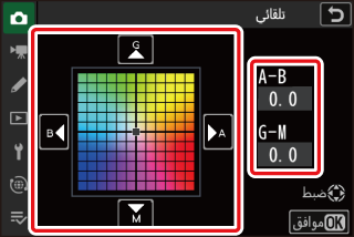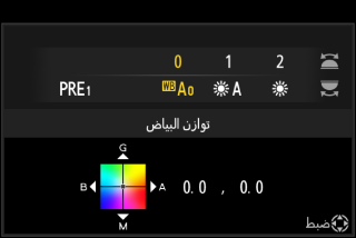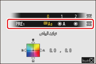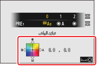 للحصول على معلومات عن [] لتوازن البياض، انظر "الضبط الدقيق للضبط المسبق اليدوي لتوازن البياض" (الضبط الدقيق للضبط المسبق اليدوي لتوازن البياض).