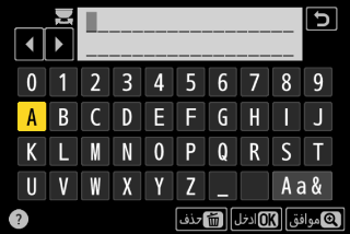لإدخال تعليق توضيحي مكون مما يصل إلى 36 حرفًا للضبط المسبق الحالي لتوازن البياض، حدد [] في قائمة توازن البياض للضبط المسبق اليدوي. أدخل تعليقًا على النحو الموضح في "إدخال النص" (إدخال نص).
