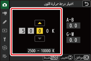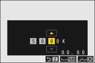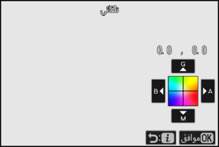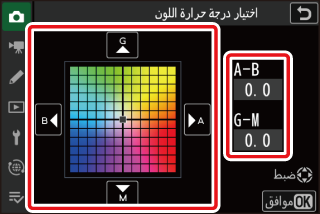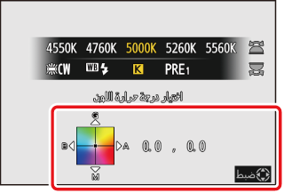 بعد اختيار درجة حرارة اللون، اضغط على زر W (Q) لعرض خيارات الضبط الدقيق. استخدم زر الاختيار المتعدد لتحديد موضع المؤشر على الشبكة.