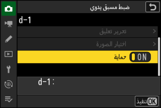 لحماية الضبط المسبق الحالي لتوازن البياض، حدد [] للإعداد [] في قائمة توازن البياض للضبط المسبق اليدوي. لا يمكن تعديل الضبط المسبق طالما تم اختيار [] للإعداد [].