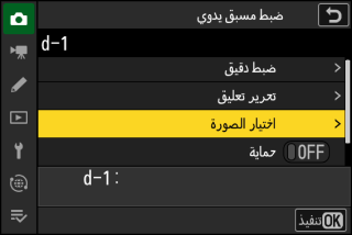 اختر [] في قائمة تصوير الصور، وظلل الخيار المطلوب، ثم اضغط على 2 كلما لزم الأمر لعرض خيارات الضبط الدقيق.