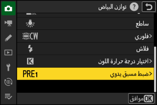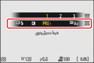 اضغط X لعرض قائمة الضبط المسبق اليدوي لتوازن البياض.