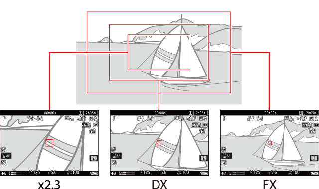 يؤدي تحديد [] للإعداد [] أو تركيب عدسة DX على الكاميرا مع اختيار [] أو [] أو [] أو [] للإعداد [] إلى زيادة الطول البؤري الظاهر بنحو 2.3× عند مقارنته بصيغة FX.