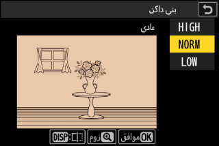 عند اختيار []، يمكن معاينة التأثير في الشاشة. لعرض الصورة التي لم يتم تحريرها، اضغط على الزر DISP مع الاستمرار.
