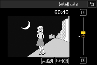 يمكن معاينة التراكب من خلال الشاشة. اضغط على 1 أو 3 لضبط التوازن بين الصورتين. اضغط على 1 لجعل الصورة الأولى أكثر وضوحًا والصورة الثانية أقل وضوحًا، واضغط على 3 لعكس ذلك.