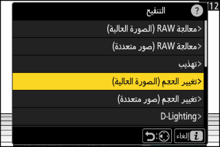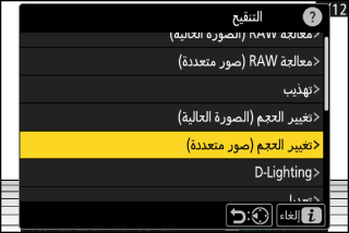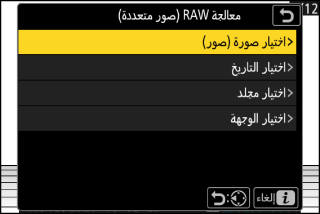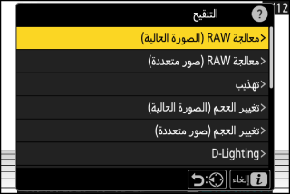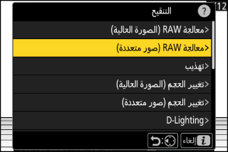 تستخدم معالجة RAW لحفظ صور NEF (RAW) بتنسيقات أخرى، مثل JPEG. استخدم [] لمعالجة الصورة الحالية، أو [] لمعالجة صور متعددة.