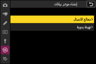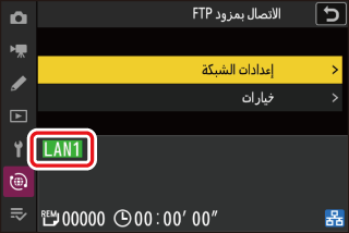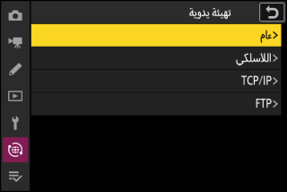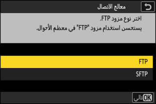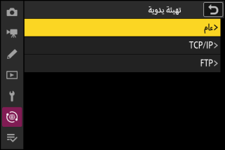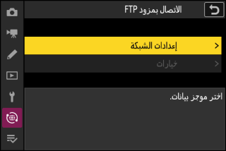 قبل تحميل الصور، وصِّل الكاميرا ومزود FTP عبر شبكة الإيثرنت أو شبكة لاسلكية. قم بالاتصال باستخدام موجز بيانات مضيف محدد عبر قائمة [] > [].