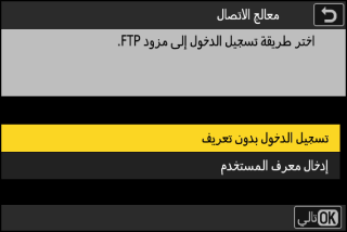 اختر هذا الخيار في حالة لا يتطلب المزود معرف مستخدم أو كلمة سر. لا يمكن استخدام هذا الخيار سوى مع مزودات تمت تهيئتها لتسجيل الدخول بدون تعريف. إذا كان تسجيل الدخول ناجحًا، ستطلب الكاميرا منك اختيار وجهة.
