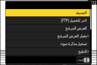يمكن استخدام العنصر [] في قائمة العرض i لعرض الصور التي تلبي المعايير المختارة فحسب (العرض المرشح). يمكن بعد ذلك تحديد جميع الصور للتحميل عن طريق تظليل [] في القائمة i والضغط على J.