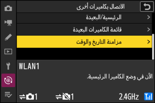 عند توصيل الكاميرات بالشبكة باستخدام [] في قائمة الشبكة، يمكن ضبط الساعات الموجودة على جميع الكاميرات الموجودة في المجموعة الحالية المتصلة على الوقت والتاريخ الذي تبينه الكاميرا الرئيسية. تنطبق المزامنة على جميع الخيارات في شاشة عرض [] بقائمة الإعداد.
