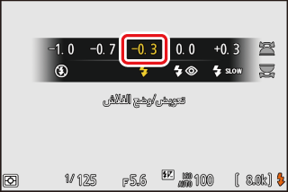 يمكن استرجاع ناتج الفلاش الطبيعي من خلال ضبط تعويض الفلاش على القيمة ±0.0. لا يتم إعادة تعيين تعويض الفلاش عند إغلاق الكاميرا.