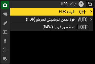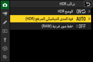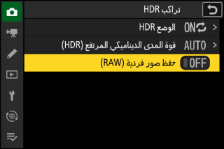 اختر [] لحفظ كل لقطة من اللقطات الفردية المستخدمة لإنشاء صورة HDR، حيث يتم حفظ الصور بصيغة NEF (RAW).