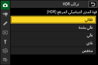 اضبط قوة المدى الديناميكي المرتفع (HDR). في حال اختيار []، ستقوم الكاميرا تلقائيًا بضبط قوة المدى الديناميكي المرتفع (HDR) بحيث تلائم المشهد المطلوب تصويره. |