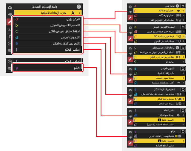 تستخدم الإعدادات الاعتيادية لتخصيص إعدادات الكاميرا لكي تناسب التفضيلات الشخصية. تنقسم قائمة الإعدادات الاعتيادية إلى مستويين.