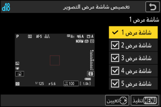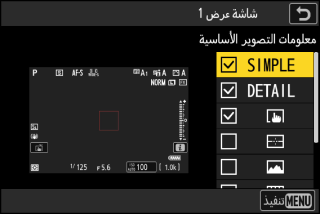 اختر شاشات العرض التي يمكن الوصول إليها عن طريق الضغط على زر DISP أثناء التصوير.