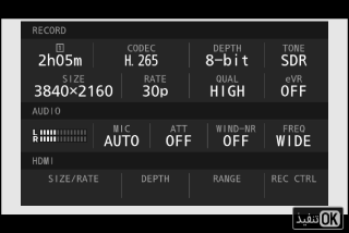 اعرض إعدادات تصوير الأفلام. يمكن استخدام هذا العنصر لعرض الخيار المحدد، وليس لتغييره.