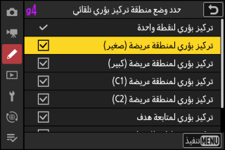 ظلل الخيارات واضغط على J أو 2 للاختيار (M) أو إلغاء الاختيار (U). الأوضاع المميزة بعلامة (M) متوفرة للاختيار عبر قرص التحكم الفرعي.
