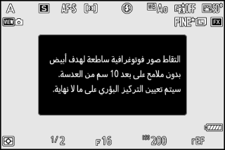 مع العدسة على بعد عشرة سنتيمترات تقريبًا من هدف أبيض عديم الملامح وجيد الإضاءة، اضبط الهدف داخل الإطار بحيث يملأ الشاشة ثم اضغط زر تحرير الغالق حتى المنتصف.