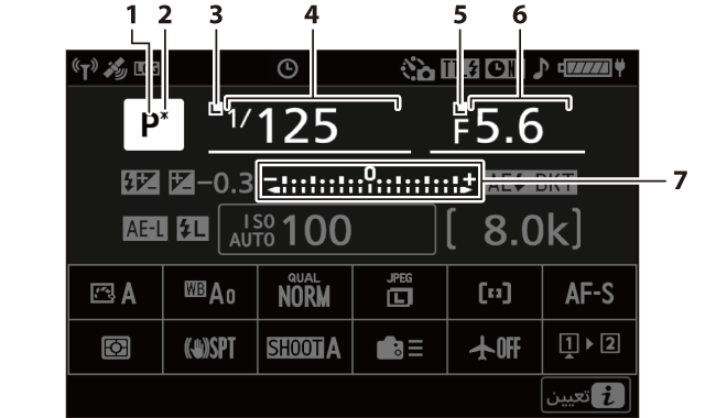 مؤشر التعريض الضوئي التعريض الضوئي (مؤشرات التعريض الضوئي) تعويض التعريض الضوئي (تعويض التعريض الضوئي) تصحيح تلقائي (تصحيح) |